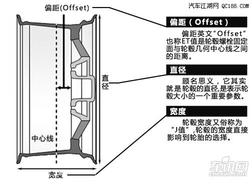 现在车主对轮毂改装都希望越大越好,这样看起来会很酷很好看,但随着轮毂尺寸的加大,轮胎的宽度和扁平比也发生了变化,那么要注意的是在原则上直径变化值要控制在原来规格的3%以内,这样才会安全。如果换上了与之前轮胎不相符合的轮毂,最好是连轮胎也一起换掉。 偏距大小要注意 不可差距过大 其次,很多人在升级轮毂的时候都会不太重视偏距。